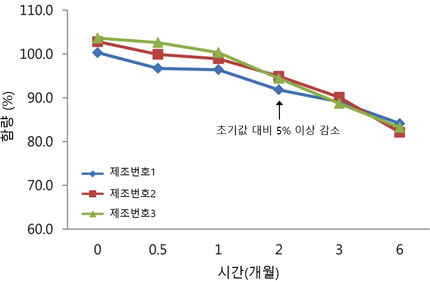 그림 설명: 서로 다른 제조 번호를 가진 니트로글리세린 설하정의 보관시간별 함량변화를 조사했습니다. 보관 시작 시점에 포장을 개봉하였으며 실리카겔과 비닐을 제거한 후, 하루 한 번 30초 간 마개 여닫기를 100일간 시행하였고, 하루 한 번 약통에서 약을 하나씩 30일 간 제거했습니다. 보관 시작 시점에 각각 100.3%, 102.8%, 103.6%이던 함량이 개봉 이후 지속적으로 감소하여 2개월 후 함량 변화가 초기값 대비 5% 이상의 감소를 나타내었고, 개봉 6개월 후에는 함량이 각각 84.1%, 82.1%, 83.2%를 나타냈습니다(1).