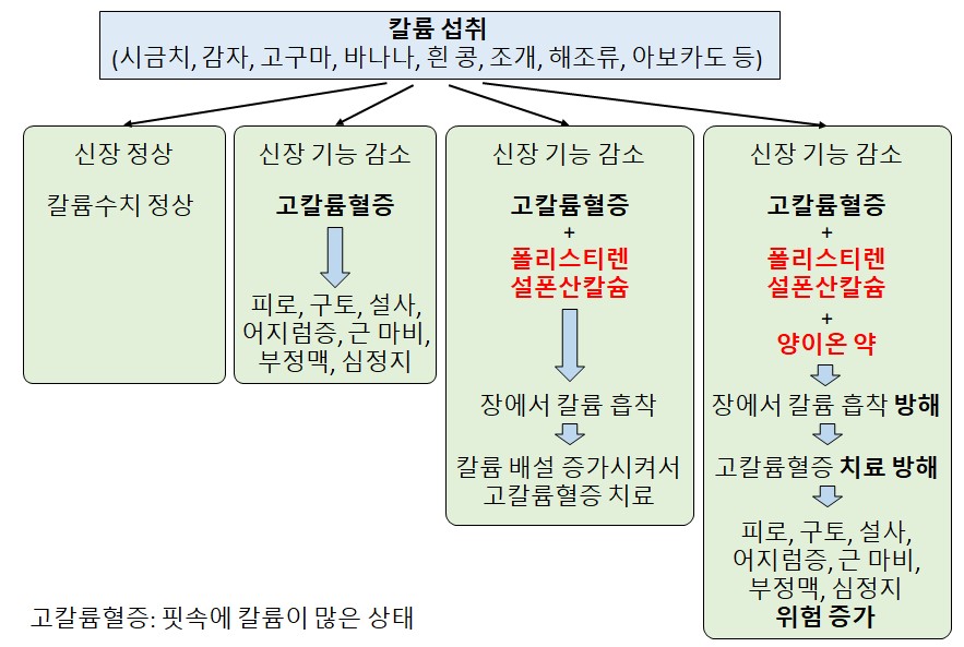 그런데 약이 위장관에 있을 때 양이온으로 이뤄진 다른 약이나 음식이 있다면 칼륨이 붙어야 할 자리에 이들이 붙으면서 폴리스티렌설폰산칼슘의 약효가 감소하게 됩니다. 그러면, 원래 목표보다 몸 속 칼륨이 조금밖에 낮춰지지 않아서 근무력감, 피로감, 반사 저하, 저린 감각, 오심, 구토, 설사 등의 증상이 동반된 고칼륨혈증이 있을 수 있고, 심한 경우 근육 마비, 호흡 부전, 저혈압, 부정맥 등의 증상을 보이다가 심정지가 올 수도 있습니다.